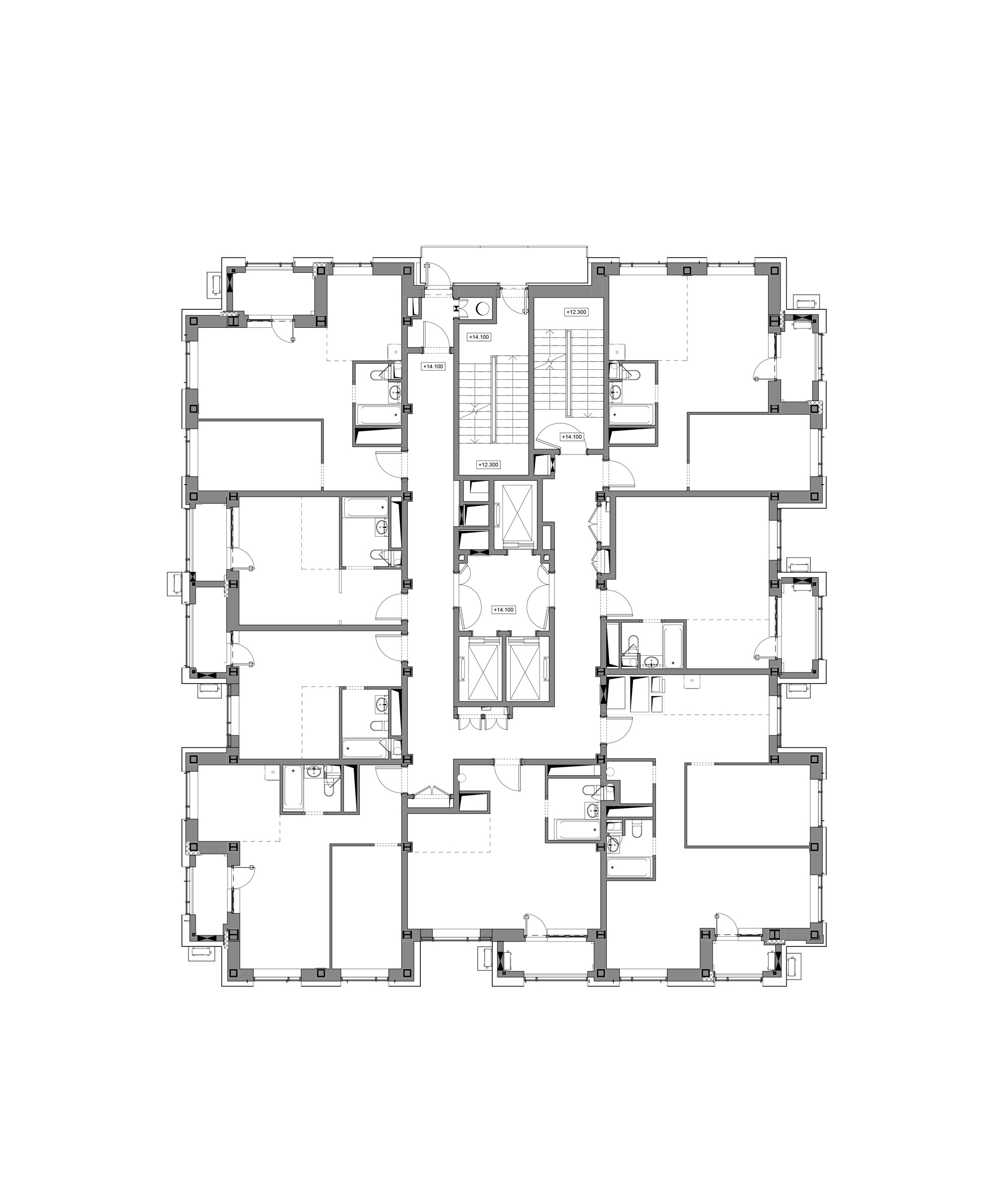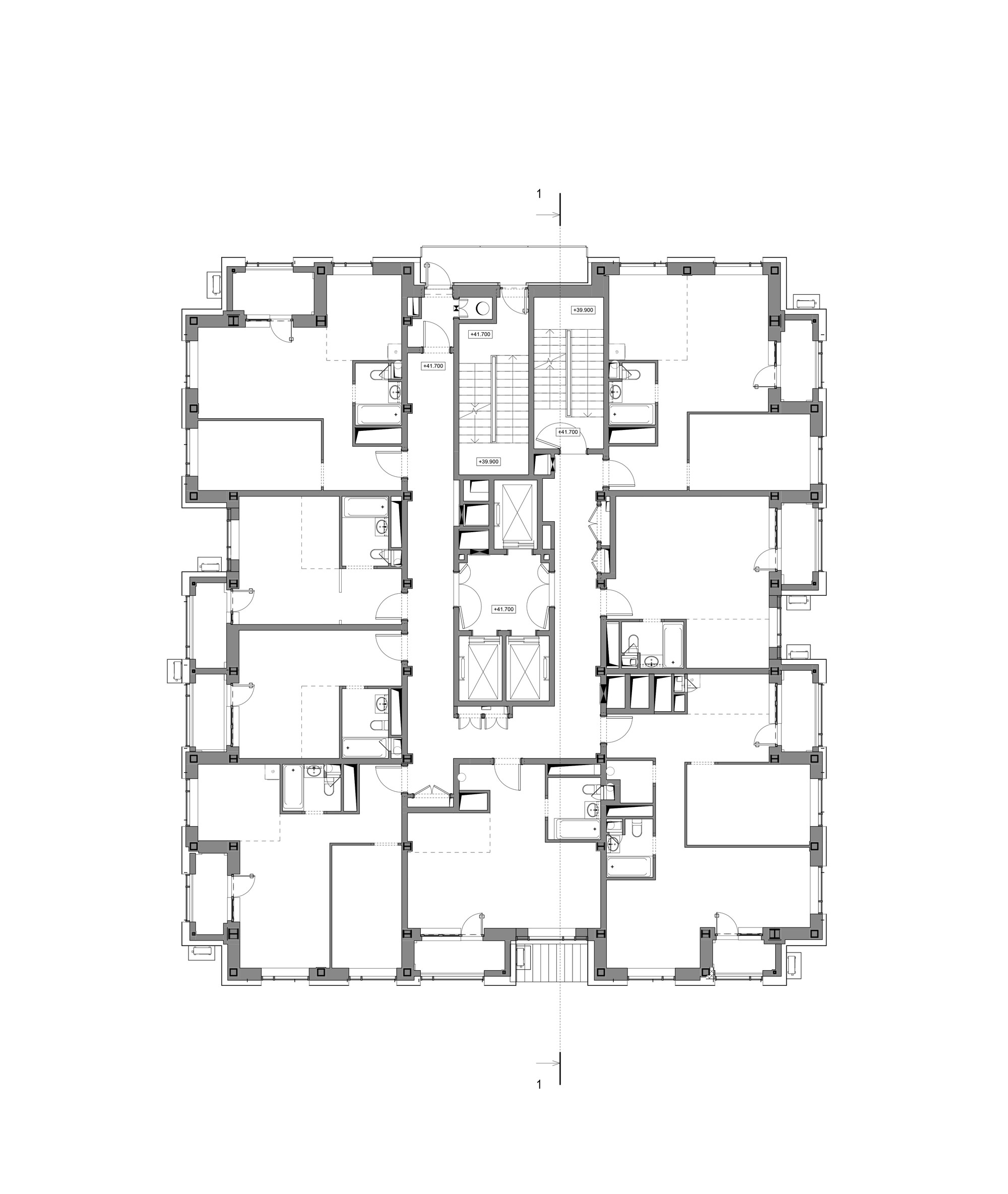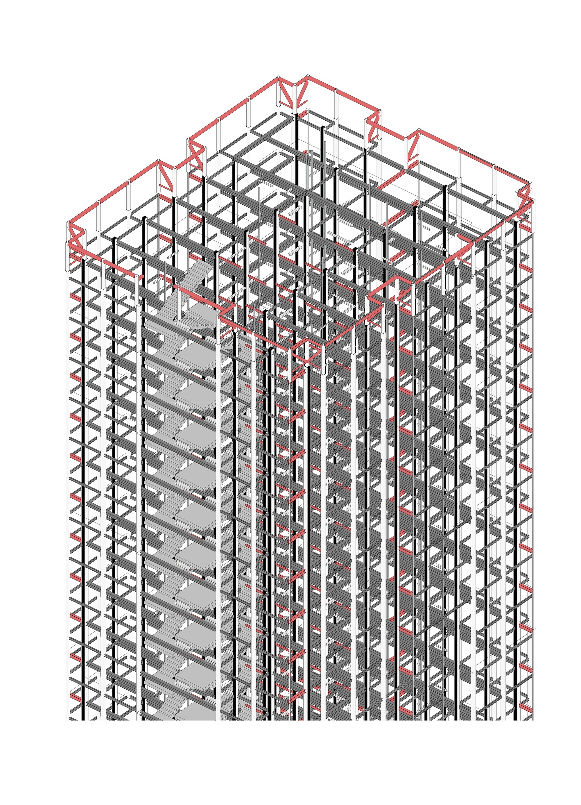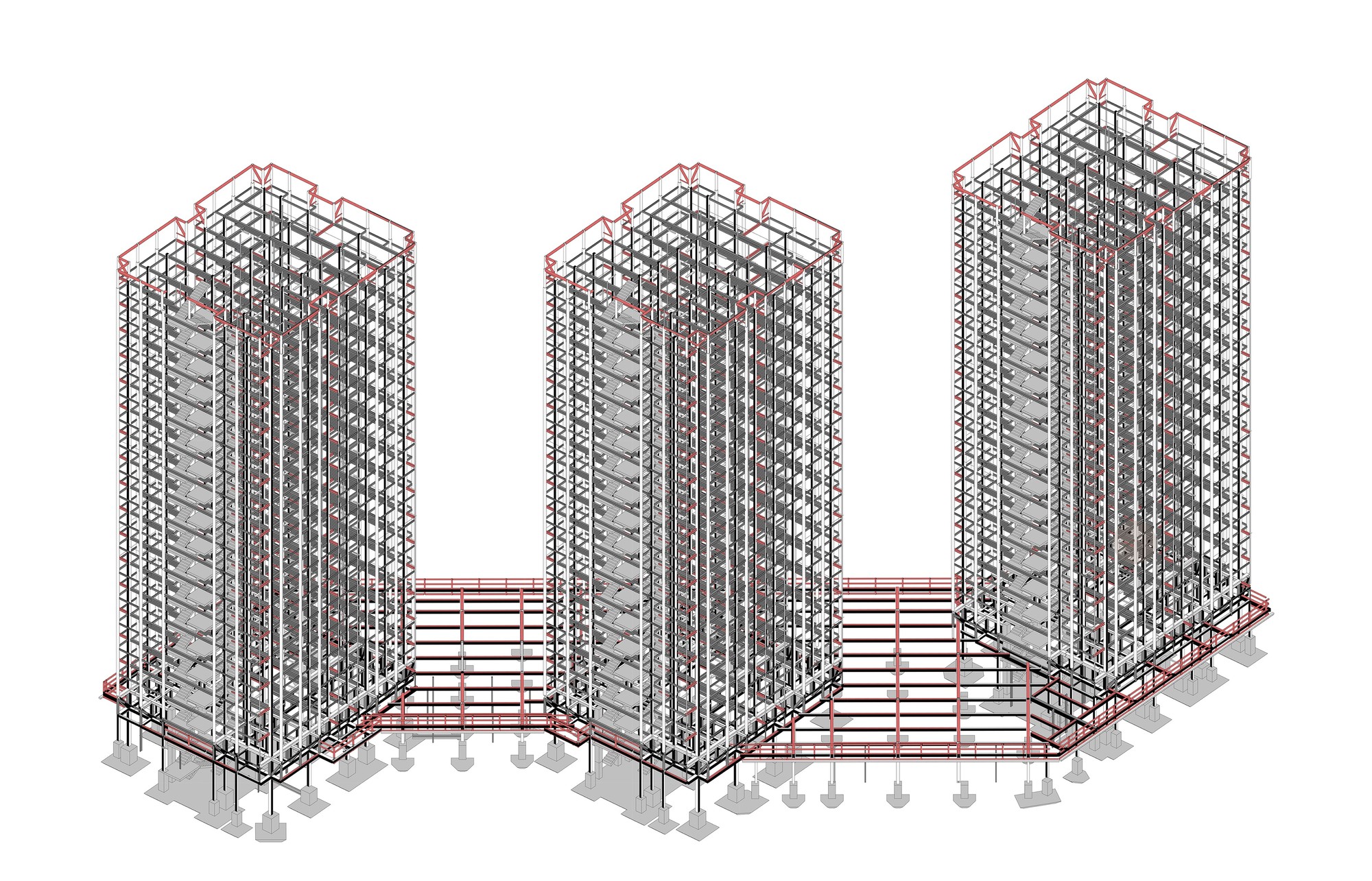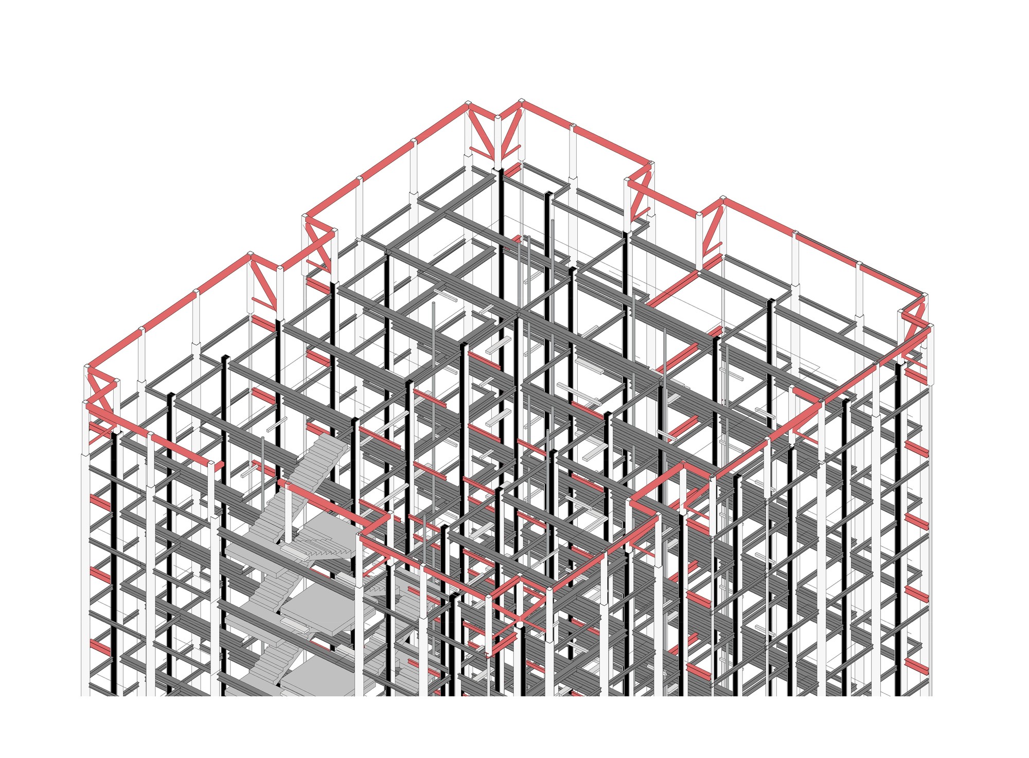 ТЕХННОЛОГИИ — на проекте решалось огромное количество технических задач, связанных с применением металлокаркаса. Его приминение позволило скомпоновать здание так, что все колонны спрятаны внутри наружных и внутренних стен, а балки утоплены в толщину перекрытий. Потребовалось разработать комплекс нестандартных решений и узлов с учетом особенности данной схемы, но в результате в интерьерах здания металлические колонны и балки никак себя не проявляют.