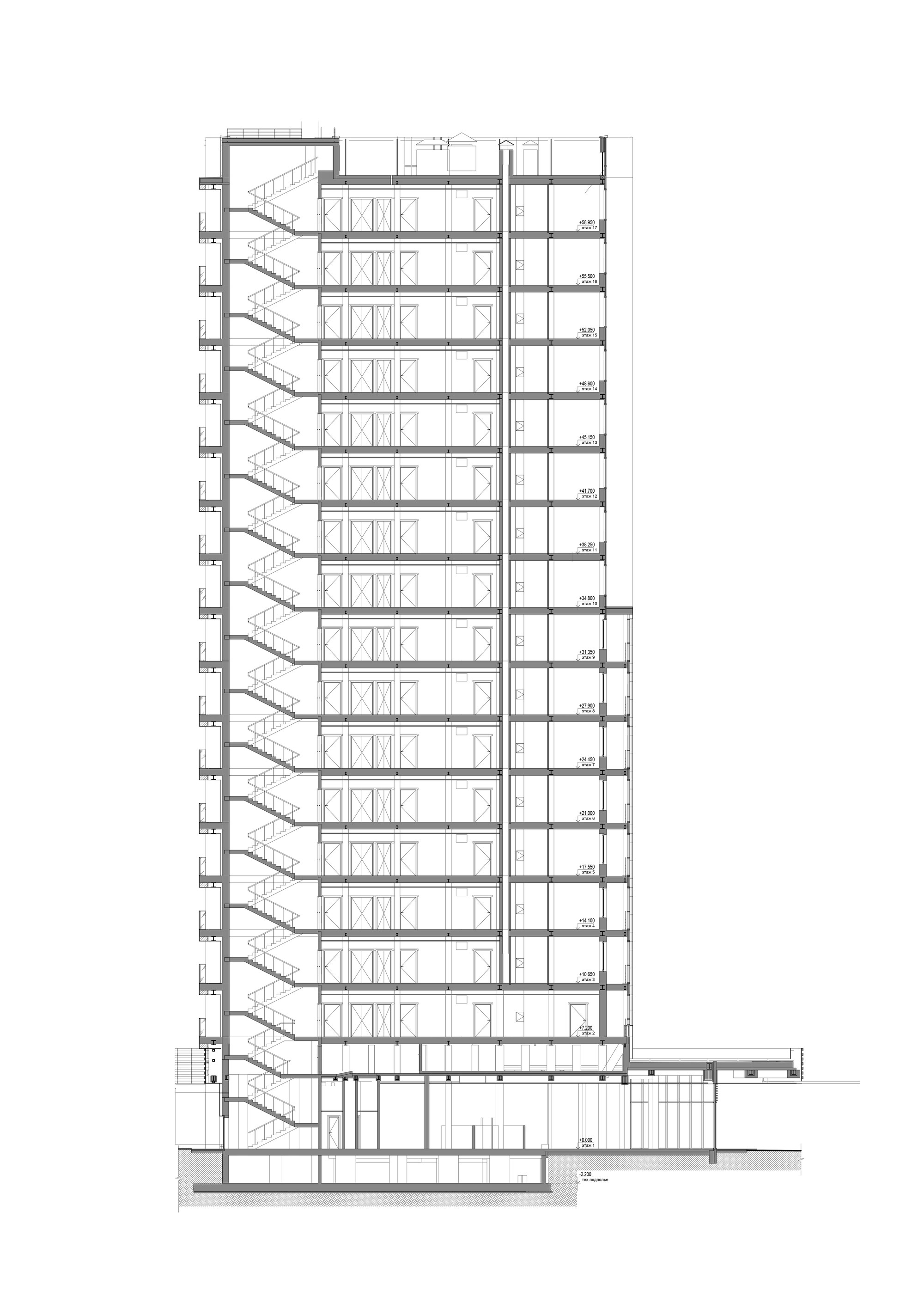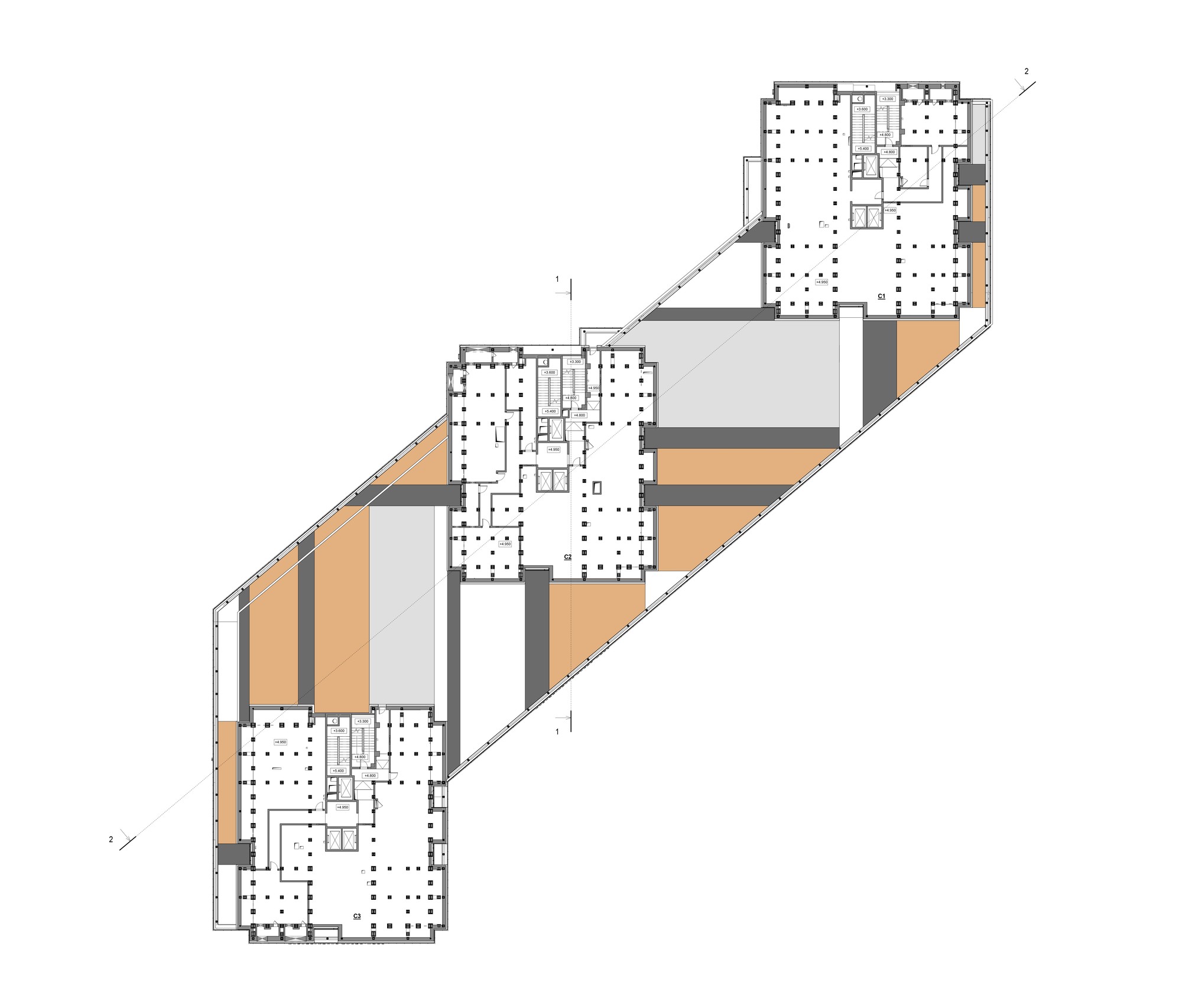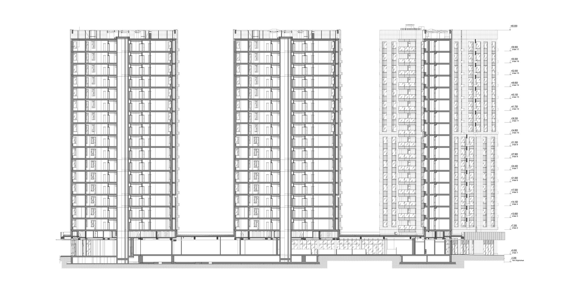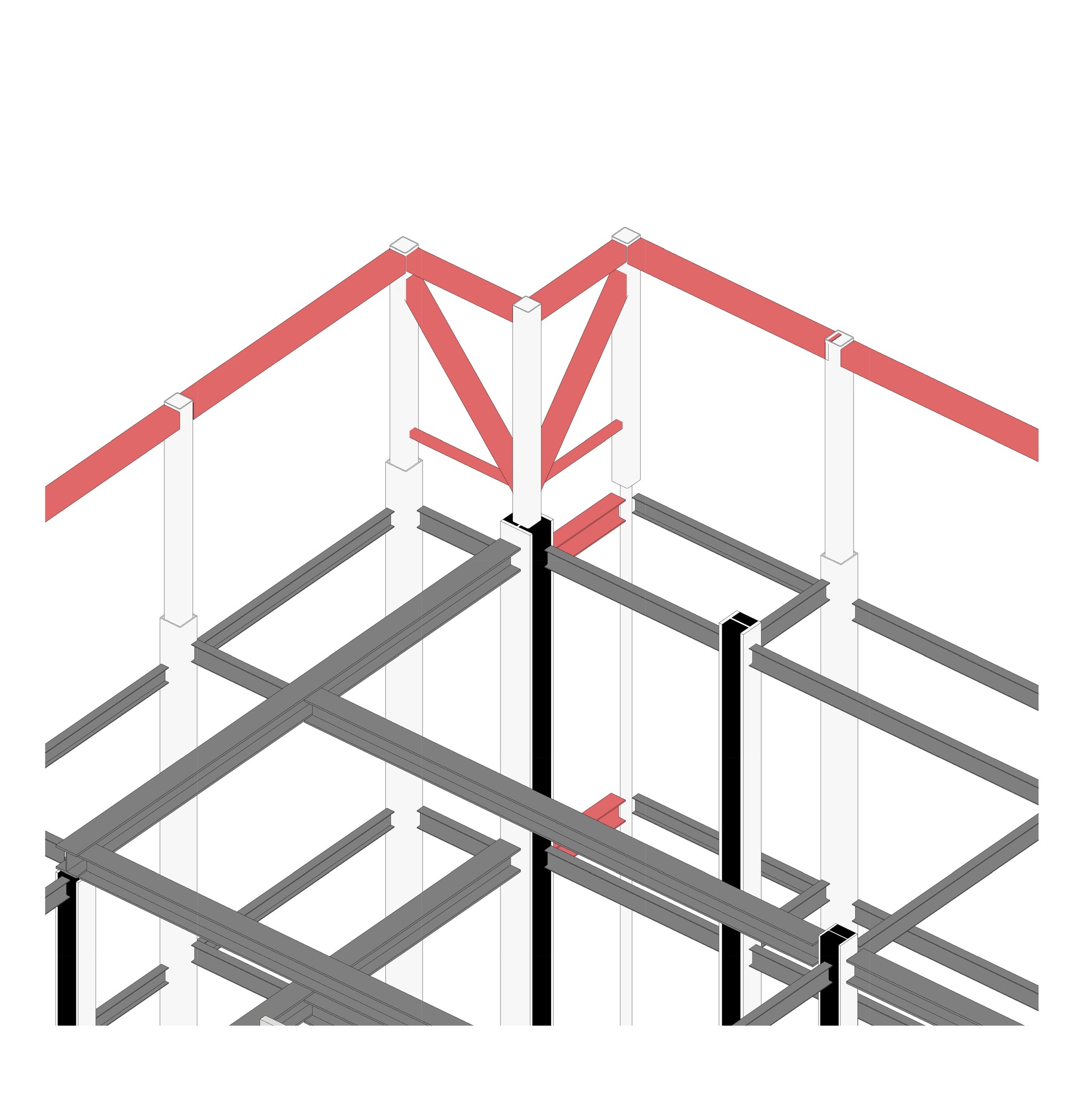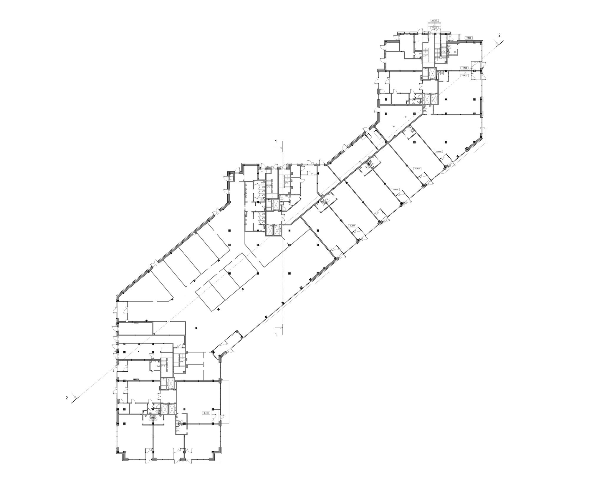 ТЕХННОЛОГИИ — на проекте решалось огромное количество технических задач, связанных с применением металлокаркаса. Его приминение позволило скомпоновать здание так, что все колонны спрятаны внутри наружных и внутренних стен, а балки утоплены в толщину перекрытий. Потребовалось разработать комплекс нестандартных решений и узлов с учетом особенности данной схемы, но в результате в интерьерах здания металлические колонны и балки никак себя не проявляют.