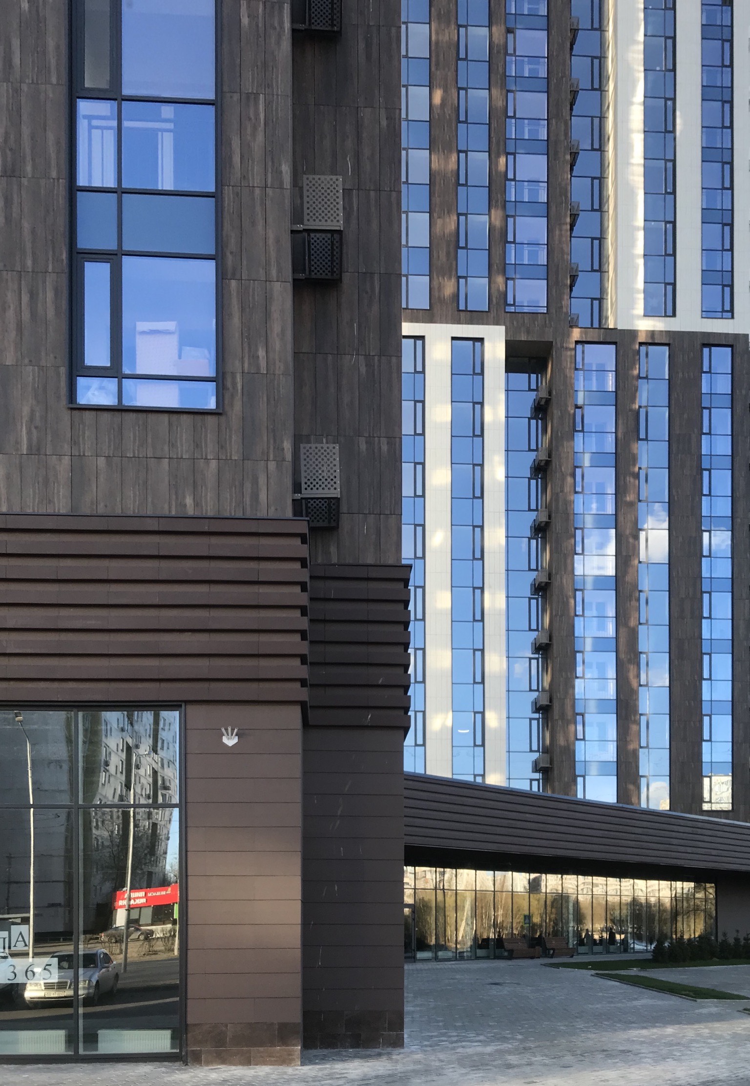 витражей. Для стереобата выбрана комбинация керамических панелей, керамических ламелей и алюминиевых витражей с
